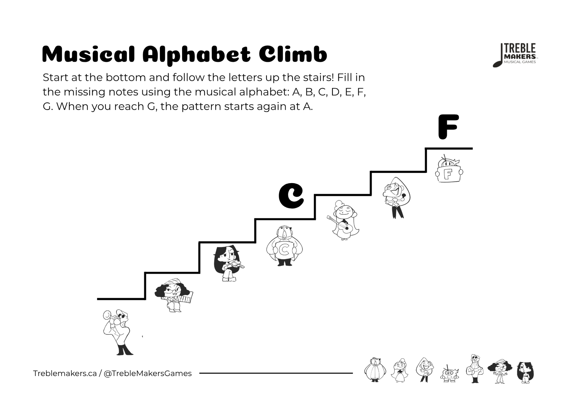 Each page challenges kids to fill in the next note in the musical alphabet, reinforcing the A–G sequence step by step. A great tool for building fluency in note order and developing musical thinking.