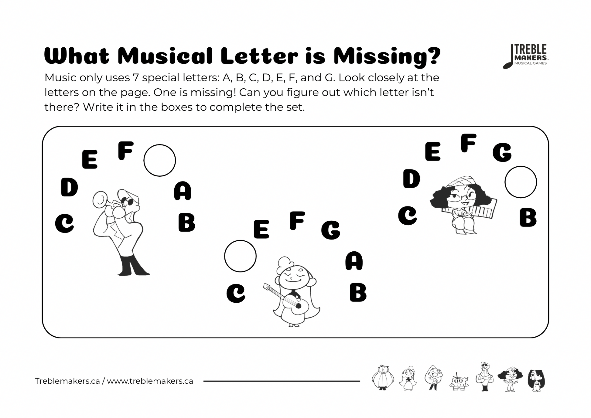 Each worksheet invites kids to spot the missing letter in short note sequences, reinforcing the circular order of the musical alphabet (A–G).
