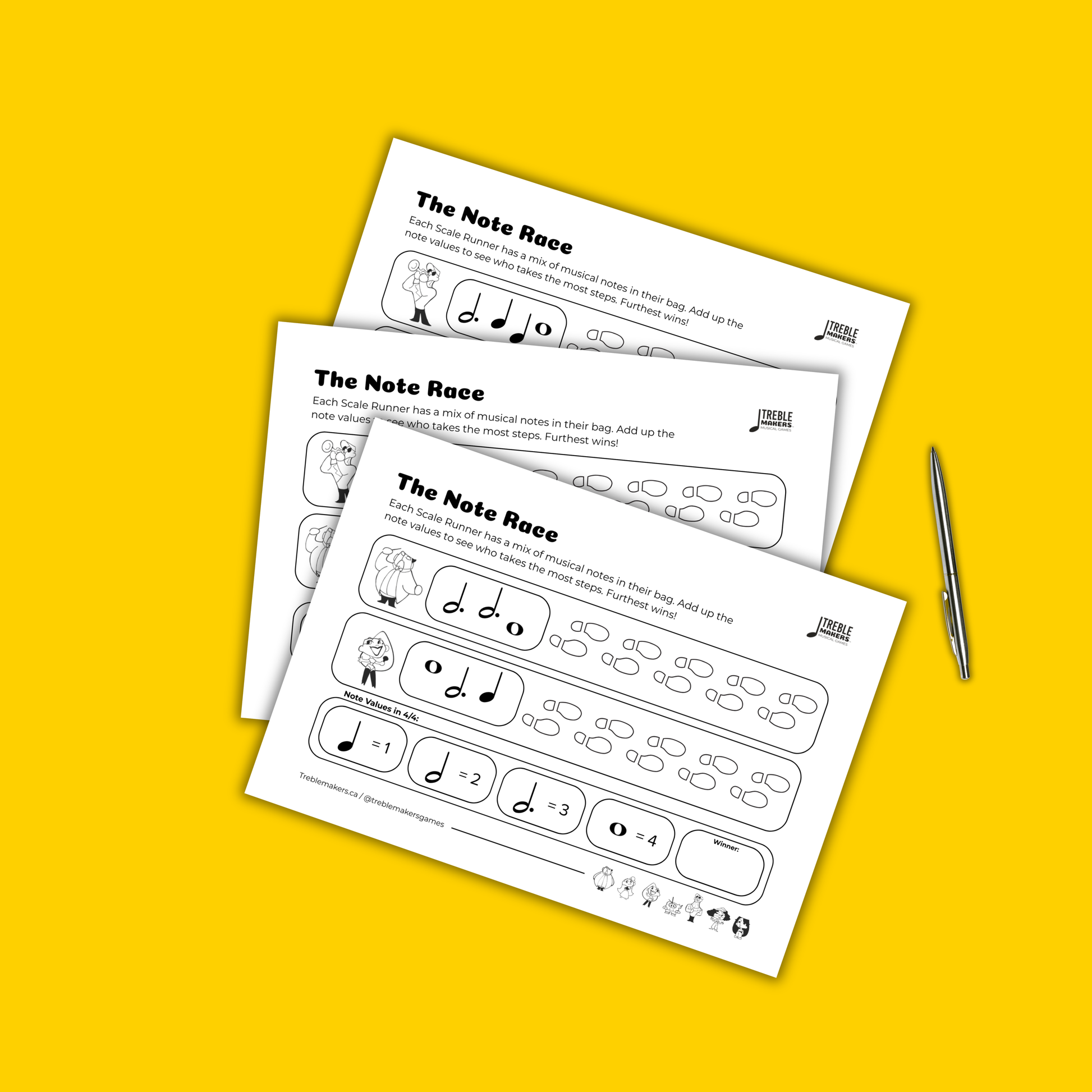 It’s a fun way to reinforce basic rhythm math and beat counting in 4/4 time—great for early learners building fluency in music notation.