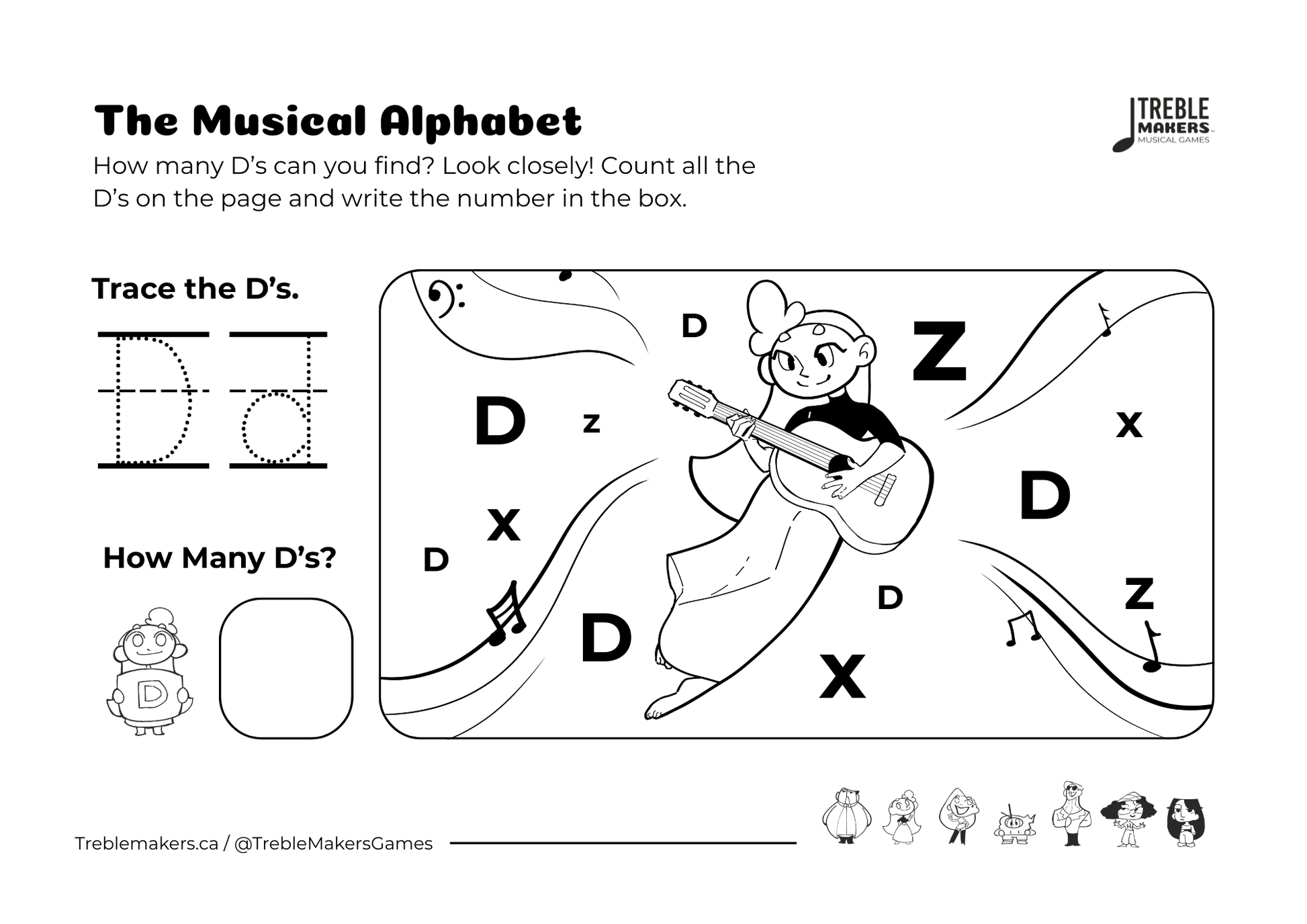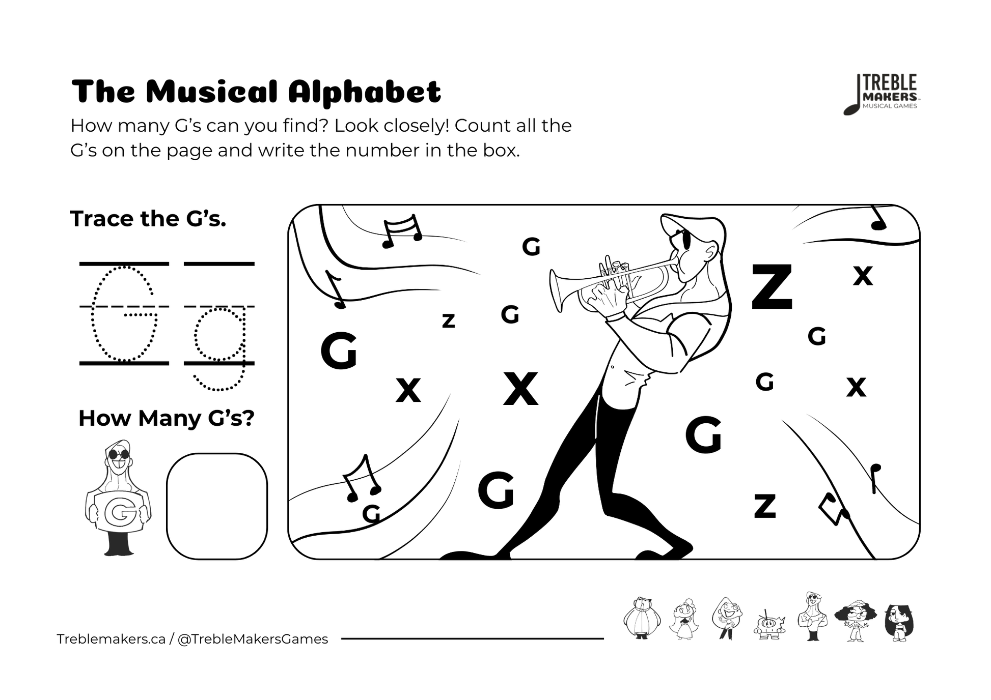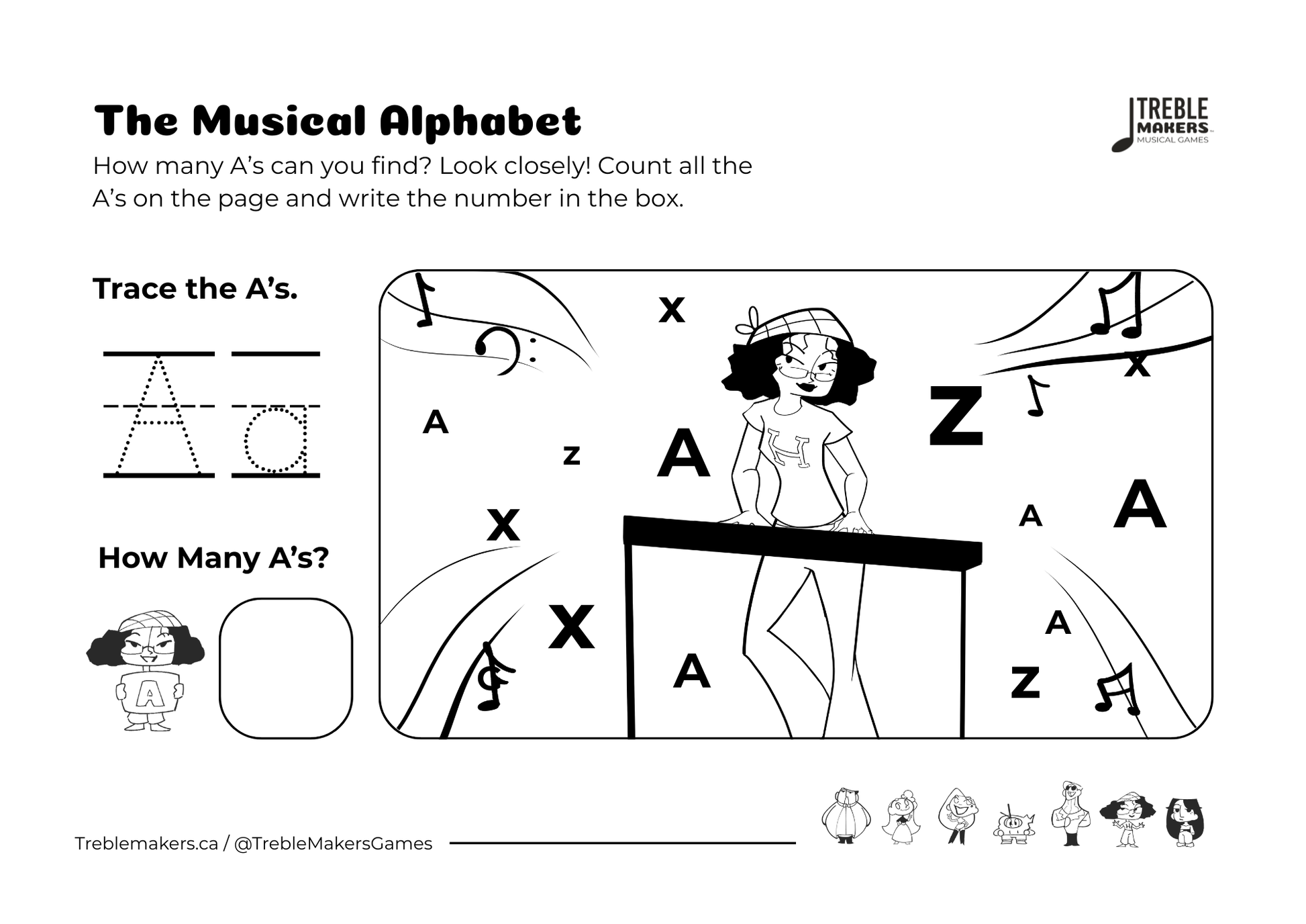 Each page focuses on one letter from A to G and invites kids to trace, find, and count musical notes in a character-filled scene inspired by Scale Runner, our music theory card game. It’s a creative way to build note recognition, letter formation, and early music skills.