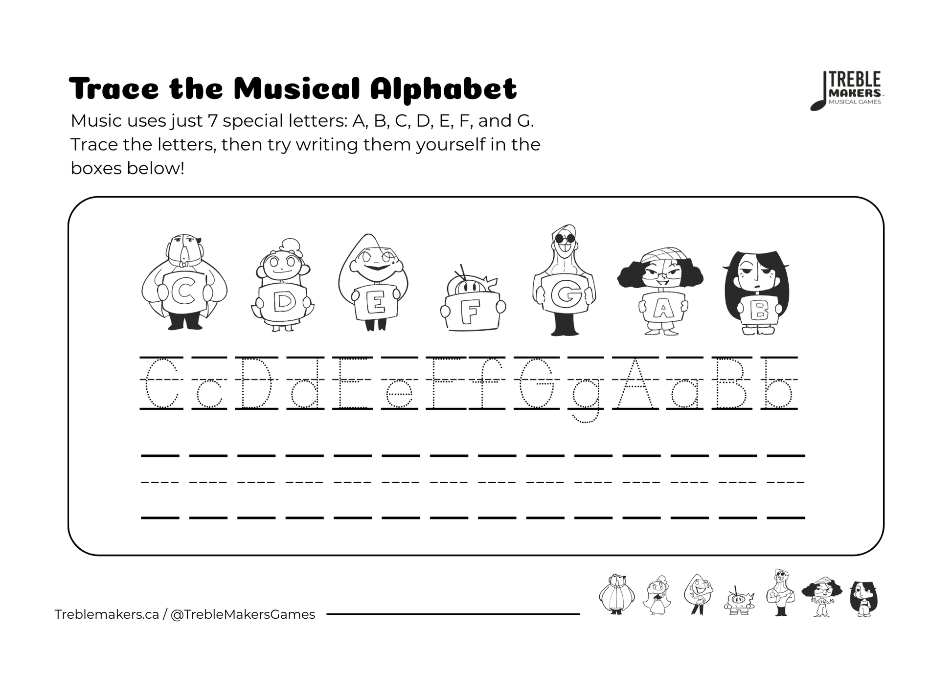 Help young learners master the musical alphabet with this focused handwriting activity!