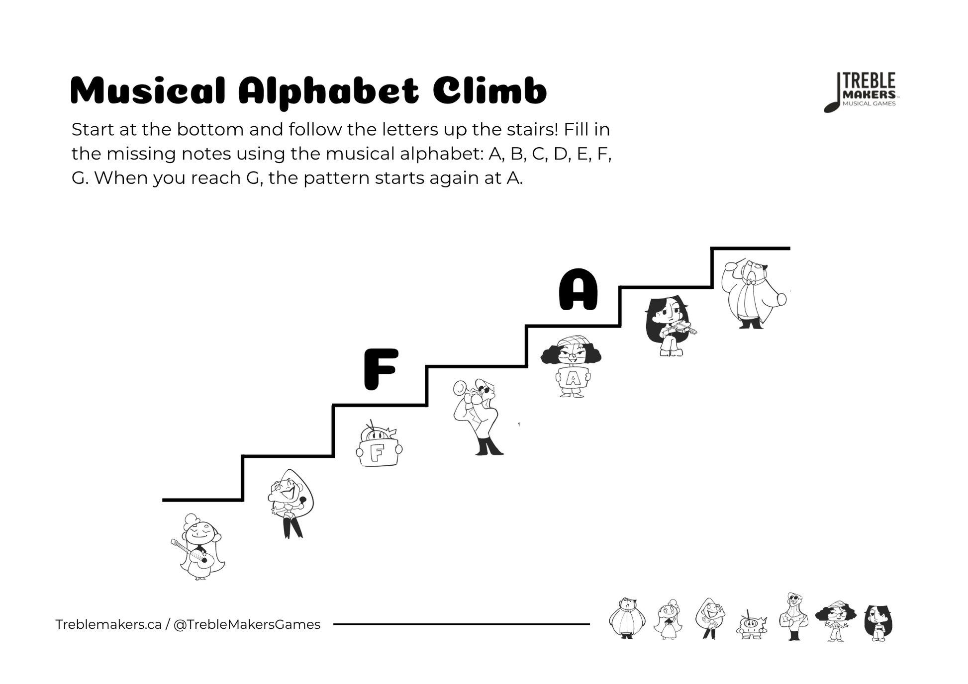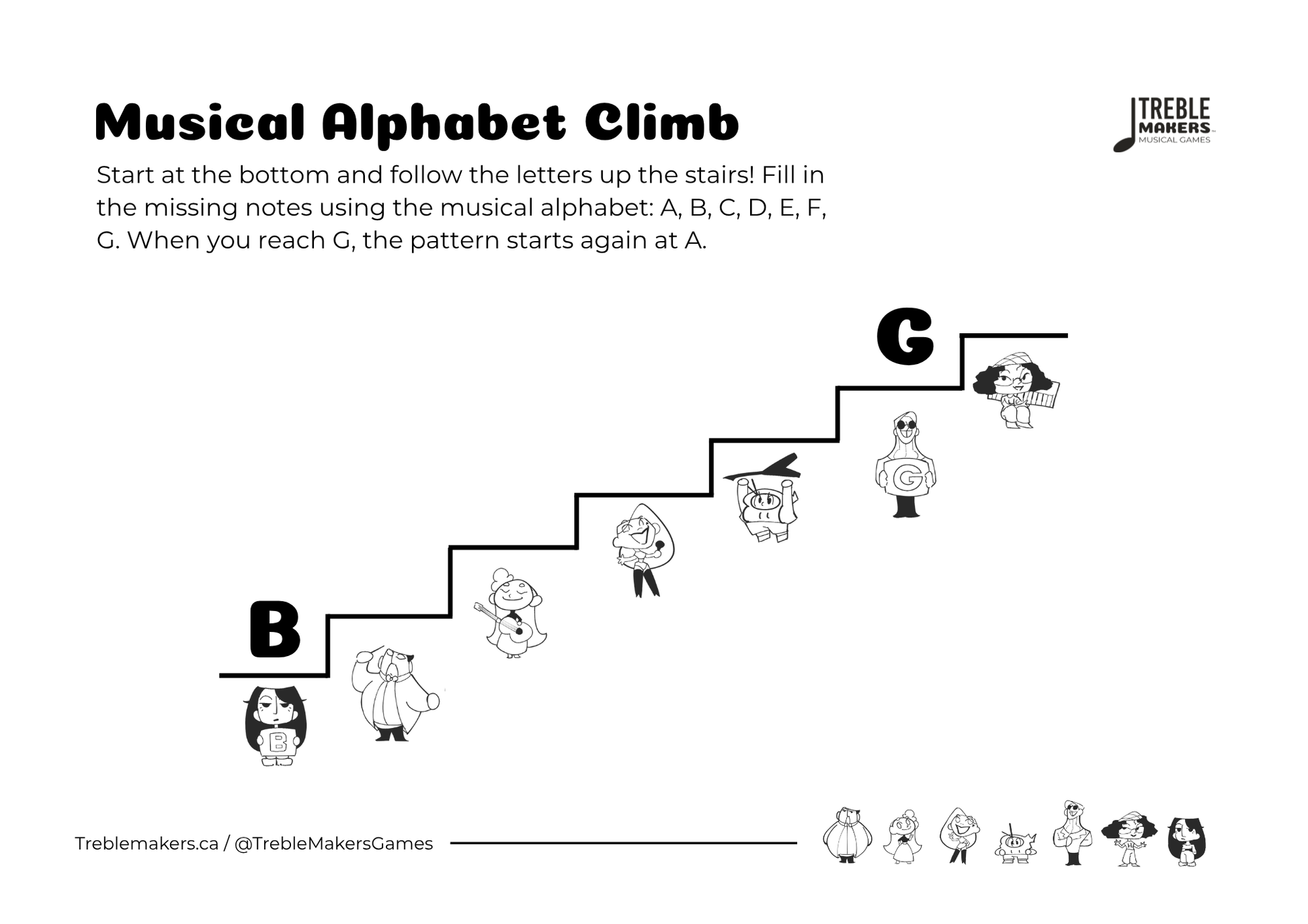 Each page challenges kids to fill in the next note in the musical alphabet, reinforcing the A–G sequence step by step. A great tool for building fluency in note order and developing musical thinking.