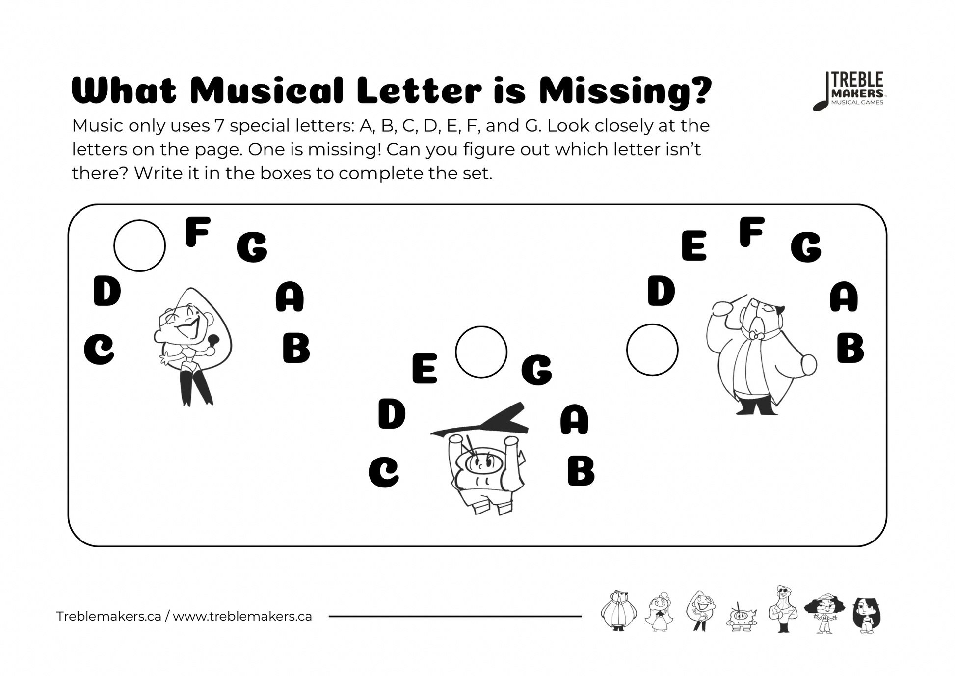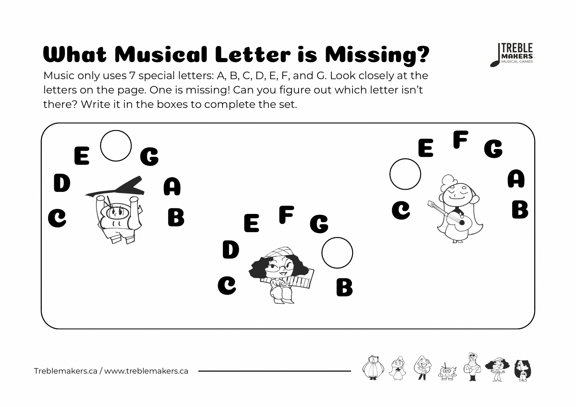 Each worksheet invites kids to spot the missing letter in short note sequences, reinforcing the circular order of the musical alphabet (A–G).