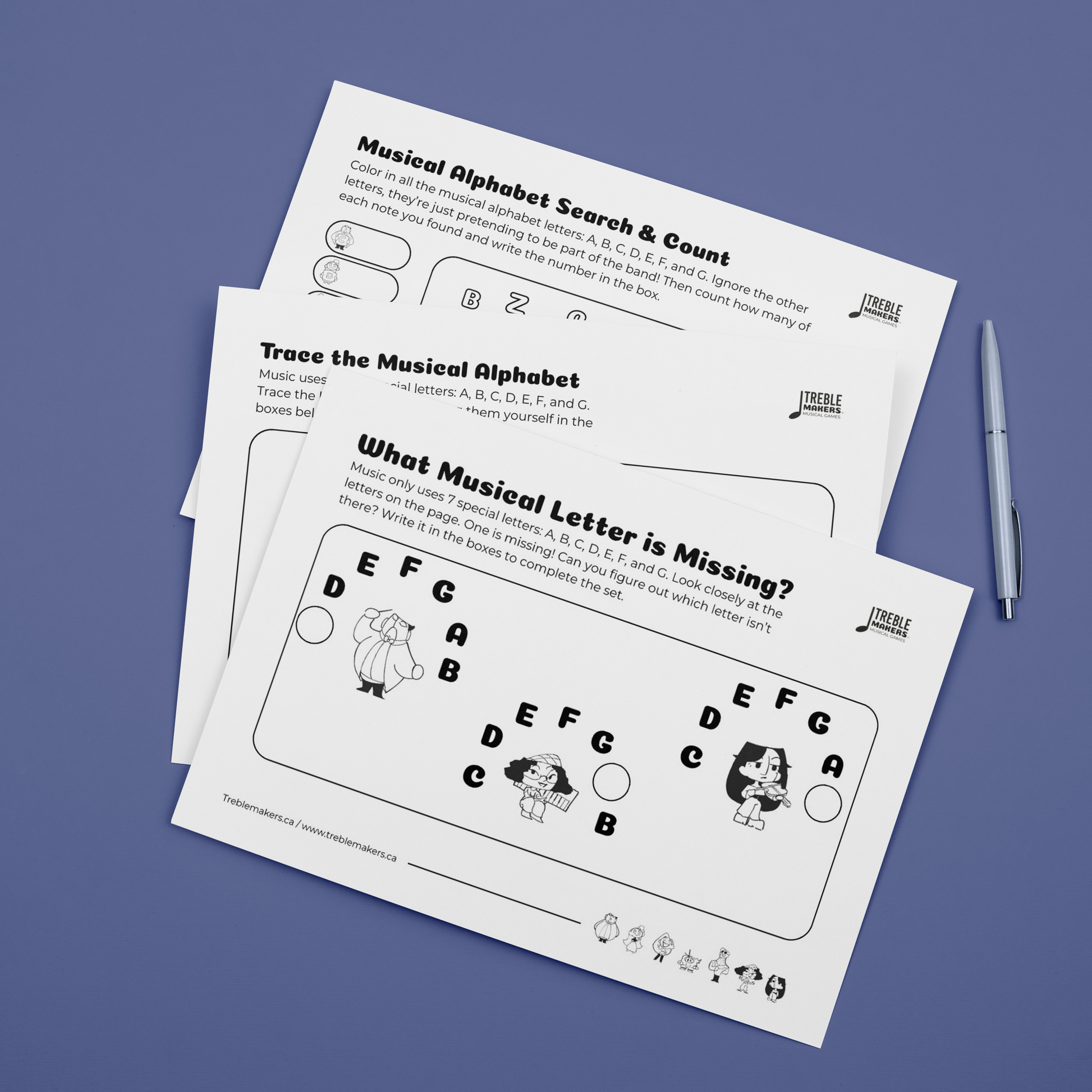 Each worksheet invites kids to spot the missing letter in short note sequences, reinforcing the circular order of the musical alphabet (A–G).
